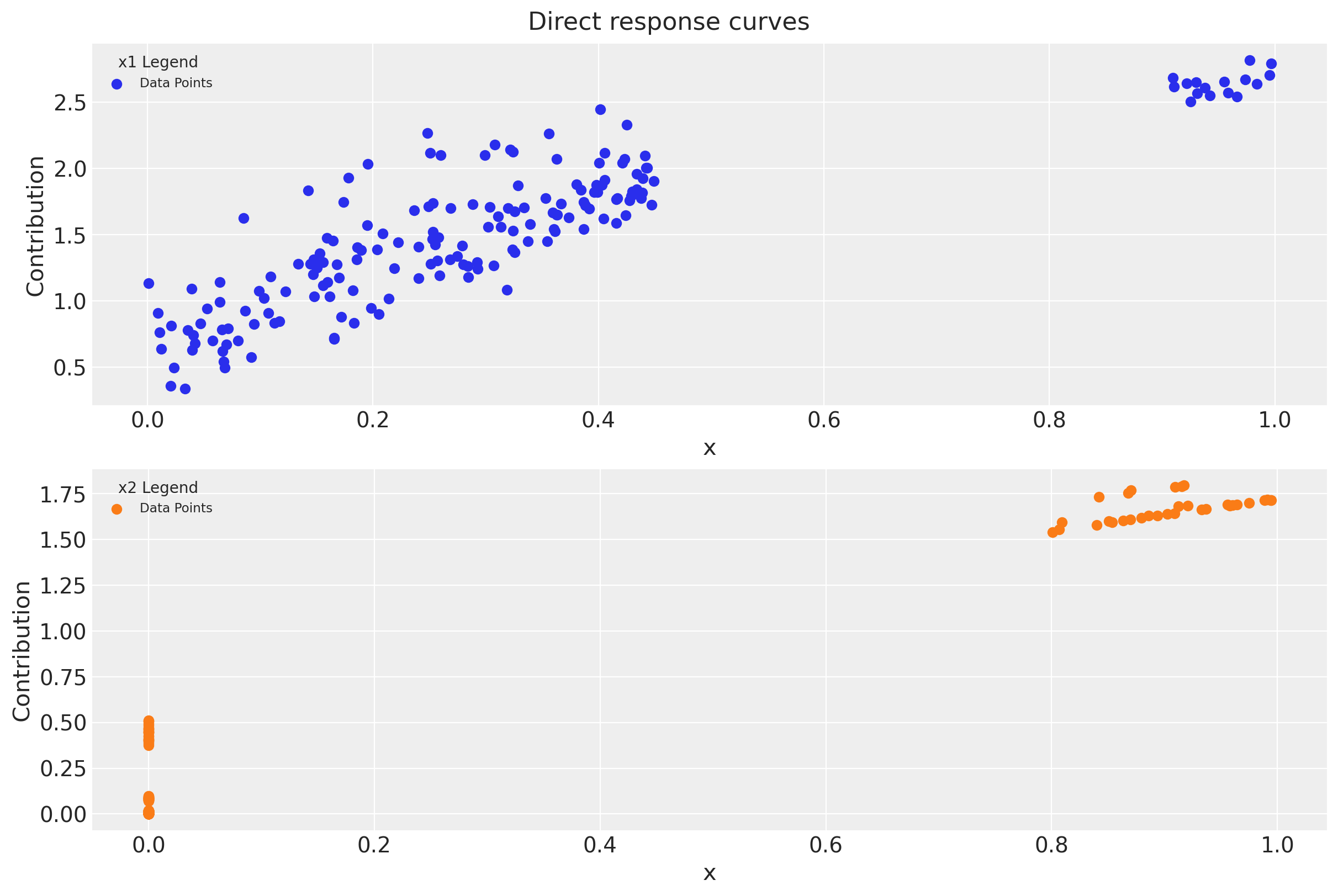 Remark: By design, \(x_{1}\) should resemble a typical paid social channel and \(x_{2}\) a offline (e.g. TV) spend time series.