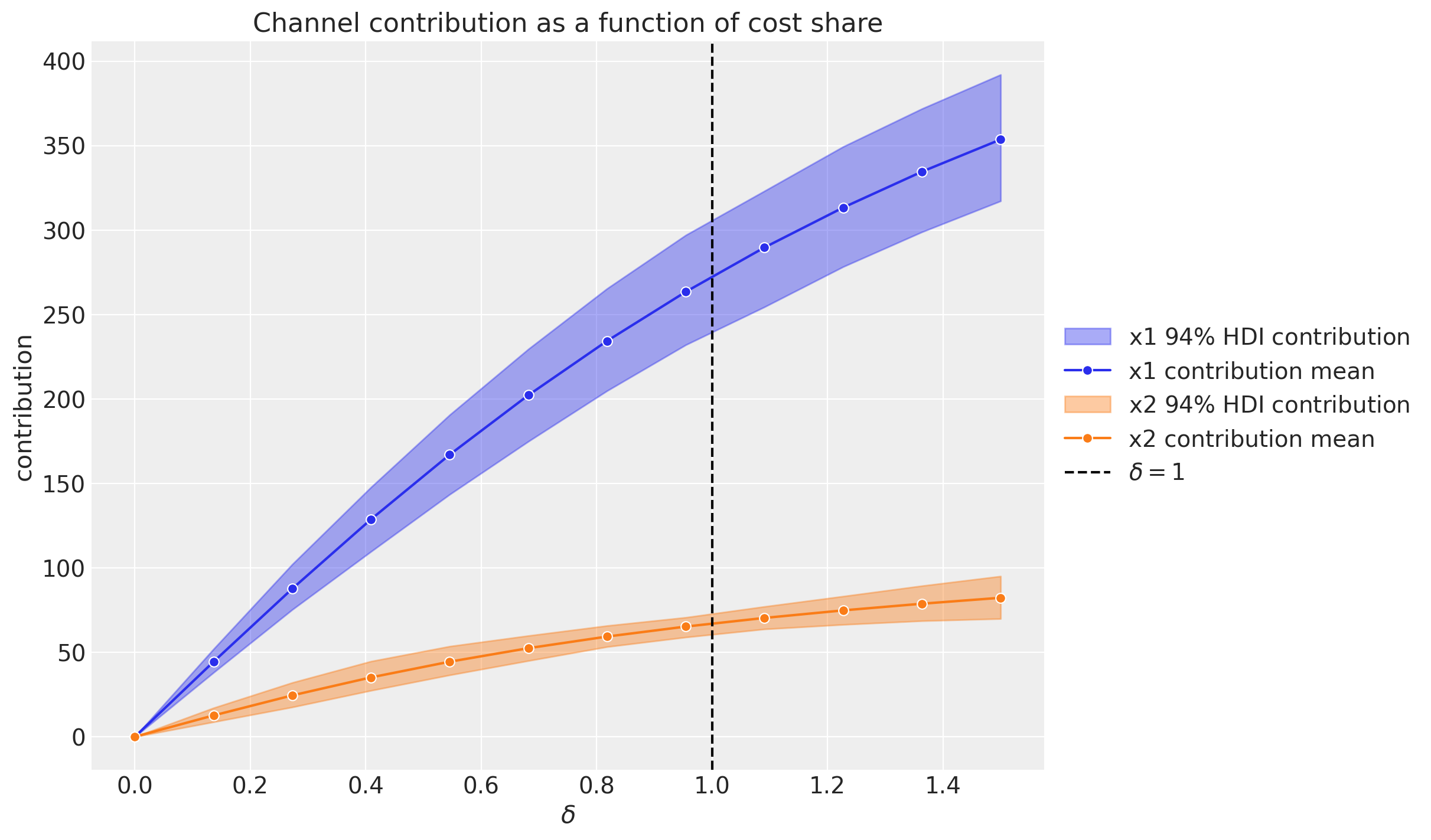 We clearly see that since \(x_1\) has a higher adstock parameter \(\alpha\) than \(x_2\), then for new spend on a single date (i.e. one_time)